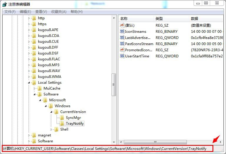 2、在打开的注册表中,依次展开以下注册项“HEKY-CURRENT-USER\Software\Classes\Local settings\Software\Microsoft\Windows\CurrentVersion\TrayNotify”。