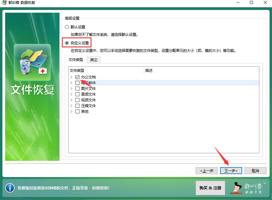 点击自定义设置并勾选办公文档,点击右下角的下一步按钮。