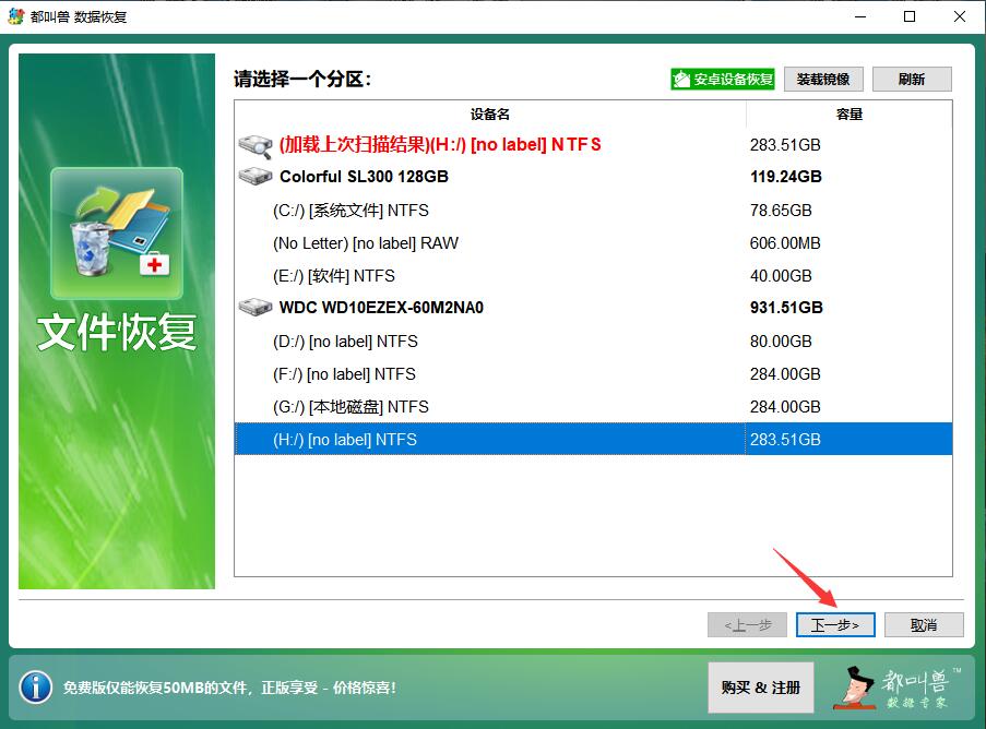 选择需要扫描的磁盘,这里以扫描H盘为例,点击右下角的下一步按钮。