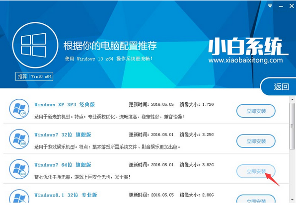 02第二步出现系统列表后,这里左上角会提示最适宜你电脑配置的系统,如你有其它个人的装机需要也可以根据自己的需求选择列表上的任意一款系统,点击“立即安装”进入下一步;
