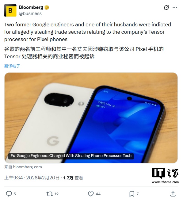 IT之家 2 月 20 日消息,据彭博社今日报道,美国司法部起诉书显示,三名谷歌前员工因涉嫌窃取该公司 Pixel 手机所用 Tensor 处理器的商业机密,已被联邦大陪审团起诉。 三人均为伊朗国